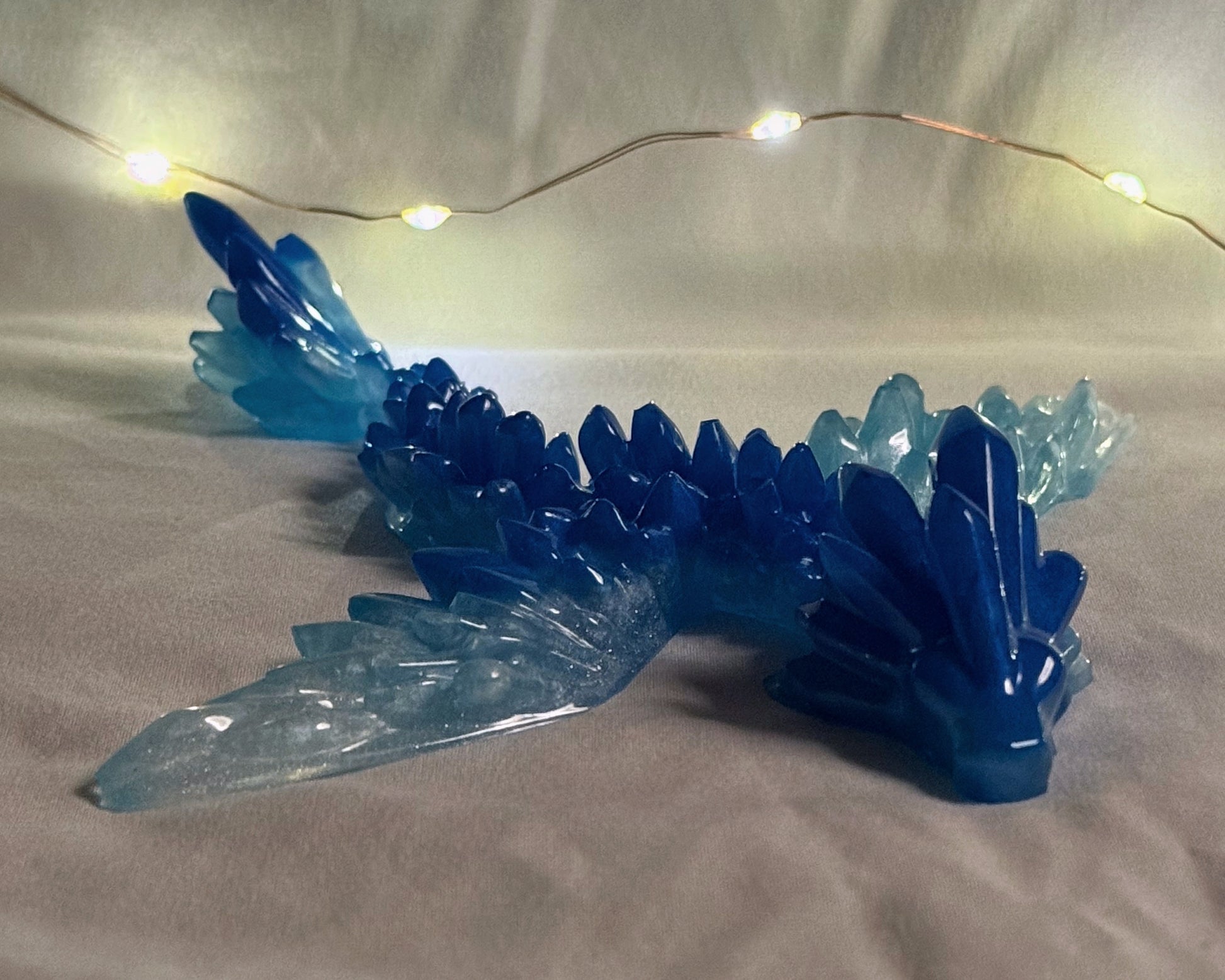 This handmade resin dragon features crystal-like details in shimmering shades of deep blue and icy light blue. Each piece is carefully crafted, making every dragon unique. Perfect for display or as a special gift for fantasy and dragon lovers.