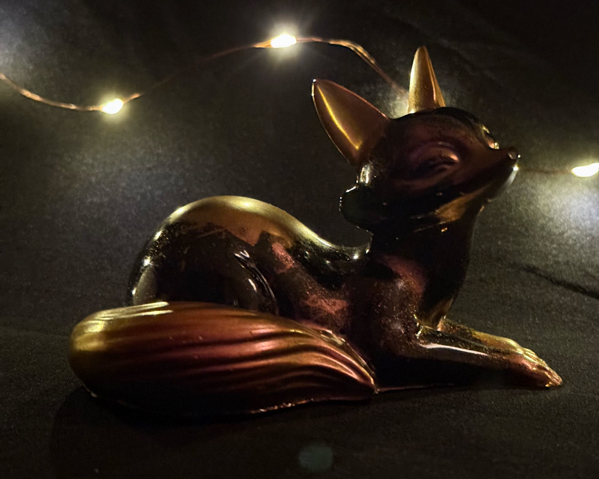This handmade resin fox features a warm metallic copper finish that shifts between gold and rose tones in the light. Its smooth surface and sculpted details give it a calm, elegant look that stands out in any display. Each fox is individually crafted, making every piece one of a kind.