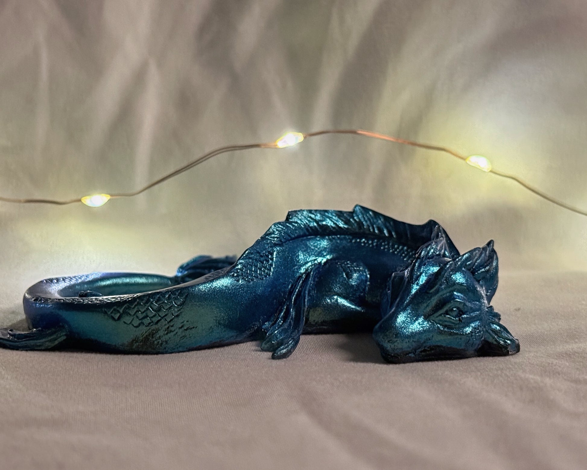 This handmade resin dragon features smooth, shimmering shades of deep blue and teal, giving it a calm and peaceful look. Its detailed scales and glossy finish make it stand out as a beautiful display piece. Each dragon is individually made by hand, so every one has its own unique color blend and character.