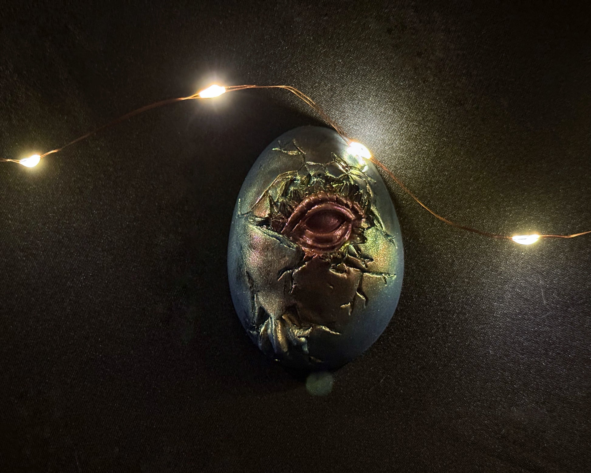 This handmade resin dragon egg features smooth metallic tones that shift between blue, green, and violet under the light. The cracked surface design reveals the shape of a dragon’s eye, adding depth and mystery to the piece. Each egg is carefully handmade, making every one slightly different and one of a kind. Perfect for display or as a special gift for fantasy lovers and collectors.