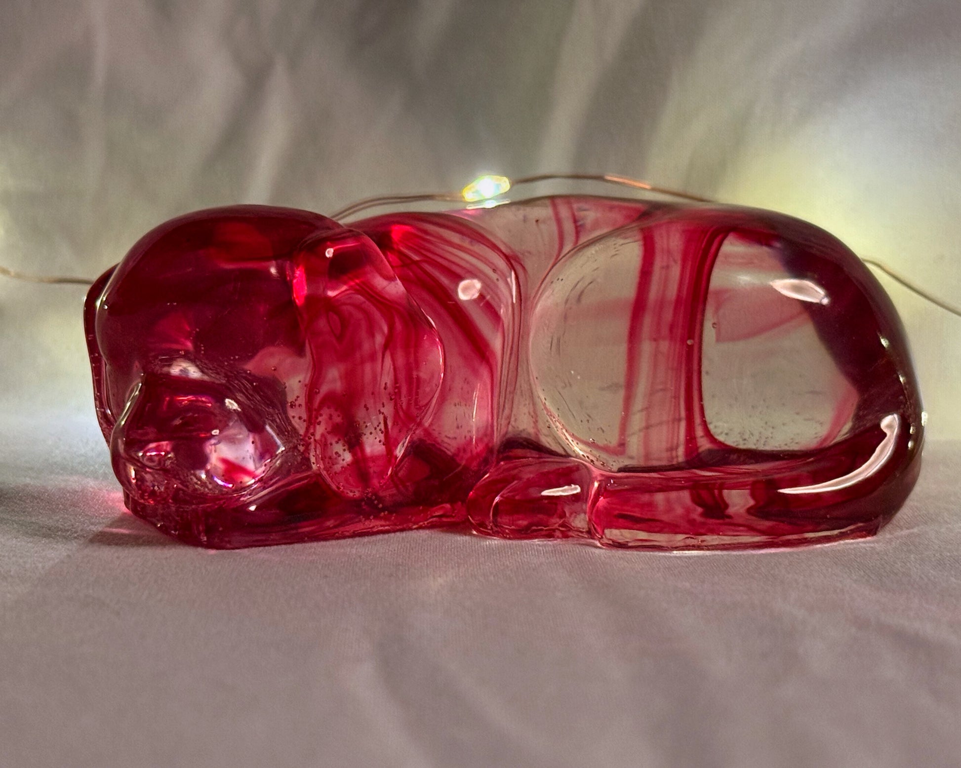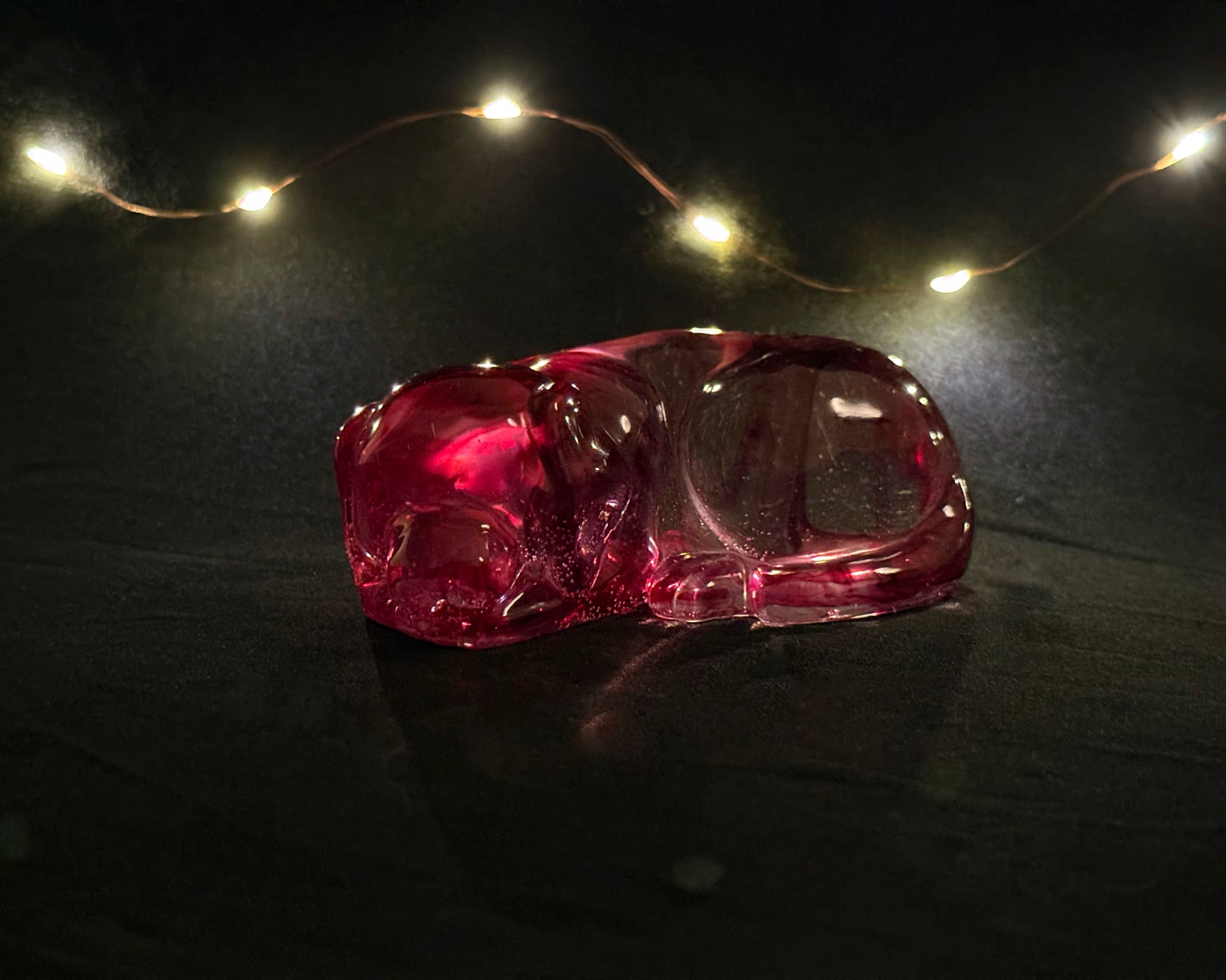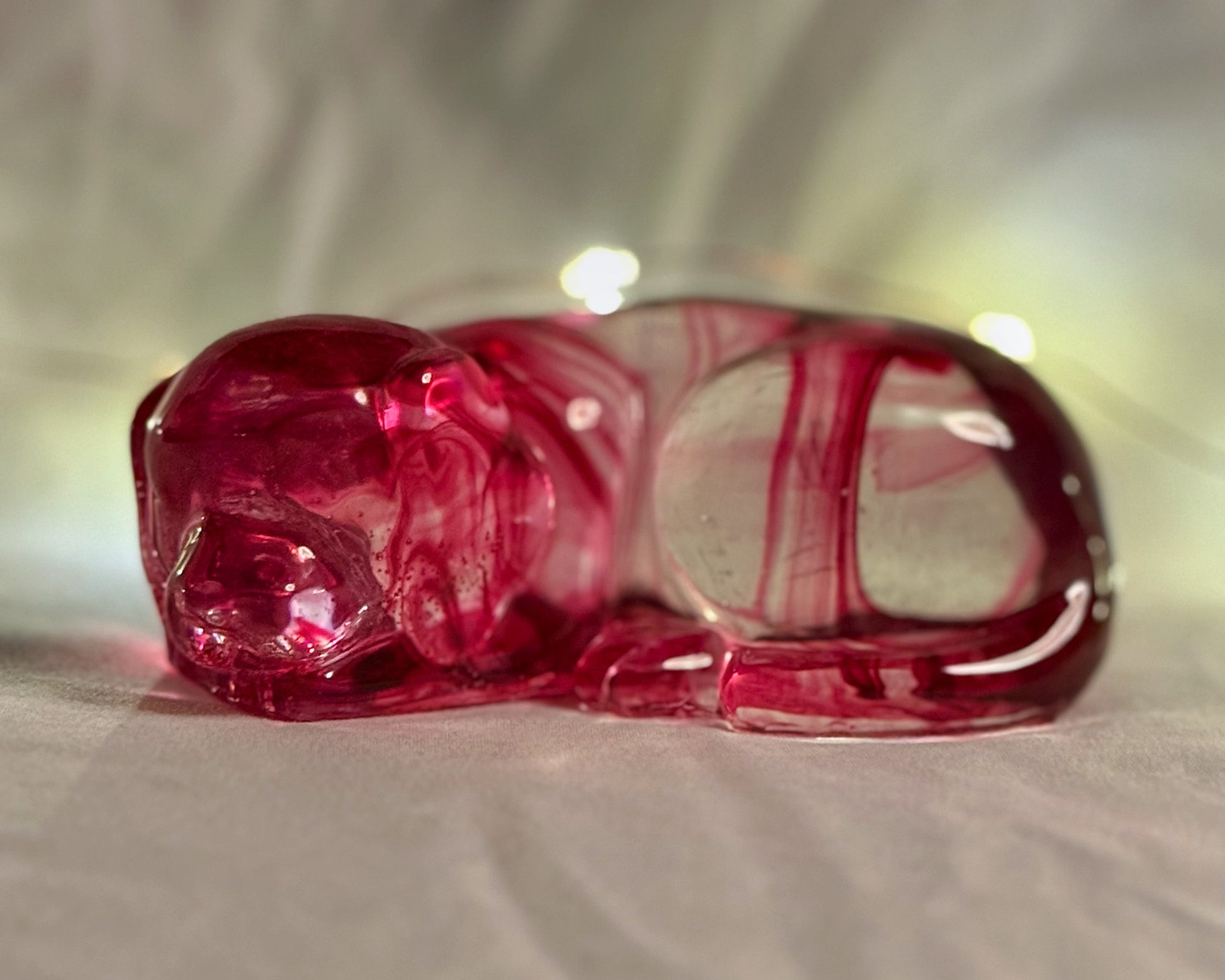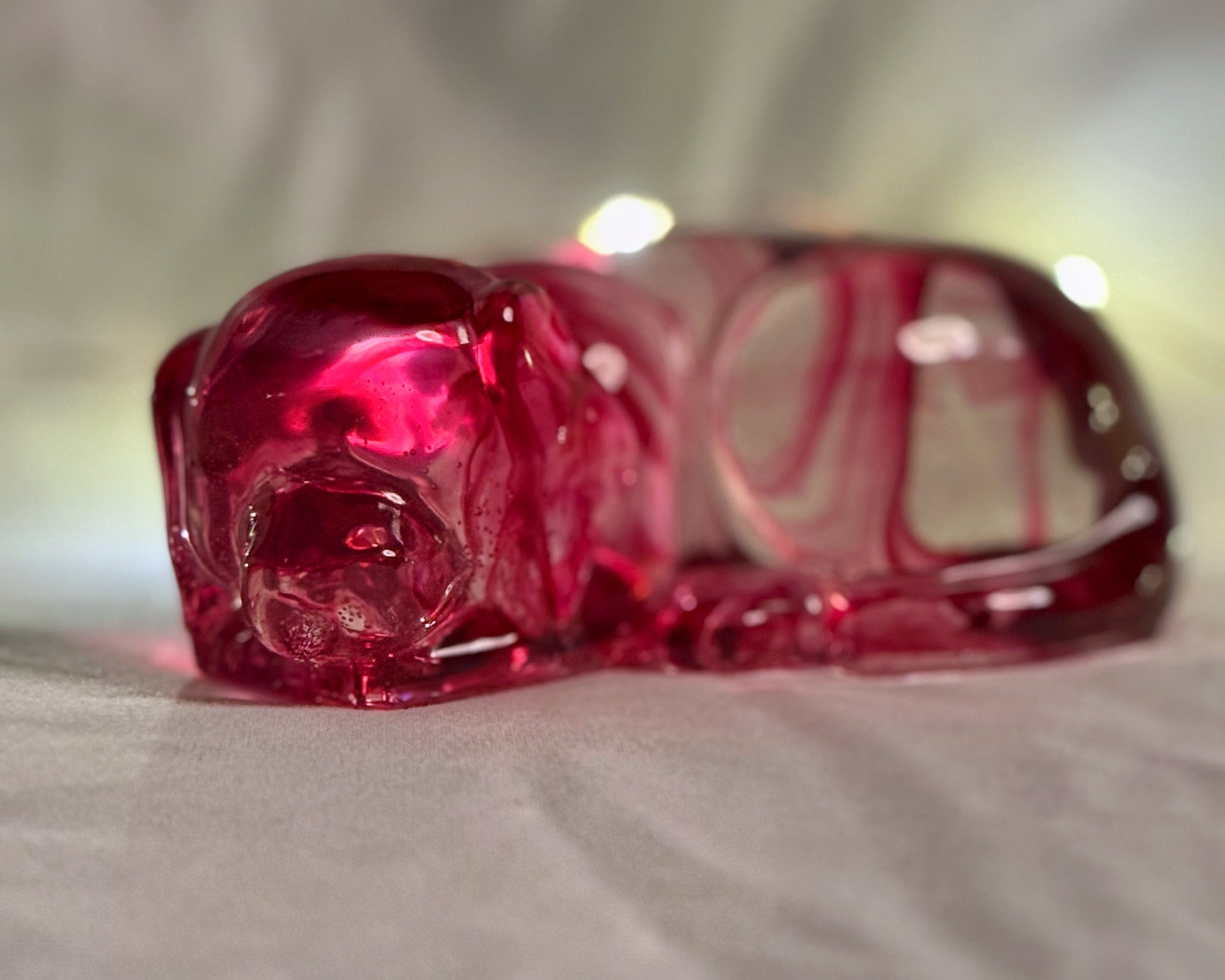 This handmade resin dog rests peacefully in a warm rose hue, with gentle marbling that catches the light in soft red tones. Its smooth, rounded form radiates comfort and calm — a perfect accent for a desk, shelf, or bedside table. Each piece is hand-poured, giving it one-of-a-kind color depth and patterning.