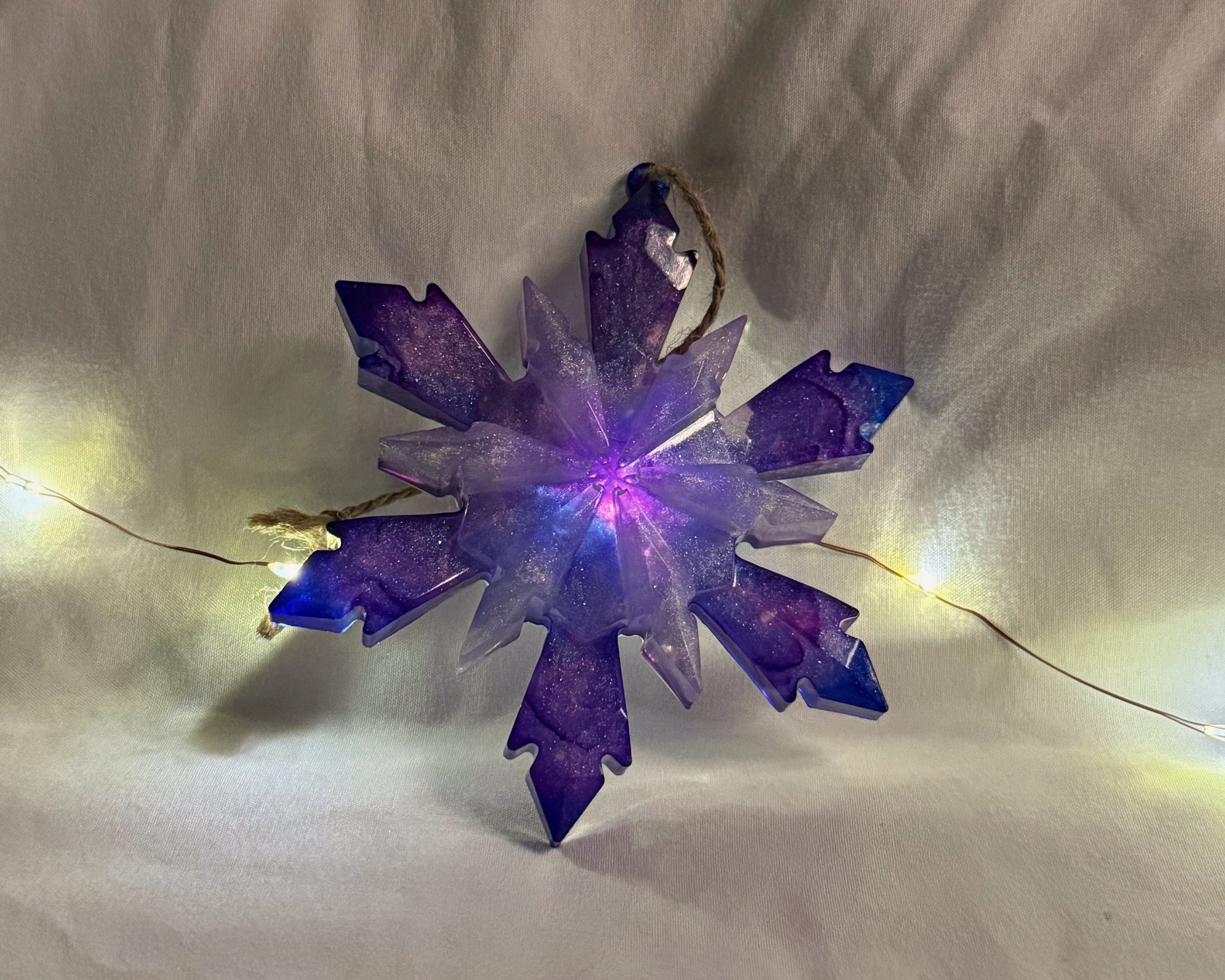 This handmade resin snowflake features rich purple hues with a subtle shimmer that reflects beautifully in the light. Its crystal-inspired shape gives it a frosted, wintery charm perfect for display or seasonal decor. Each snowflake is handcrafted, giving every piece a slightly different color blend and finish.
