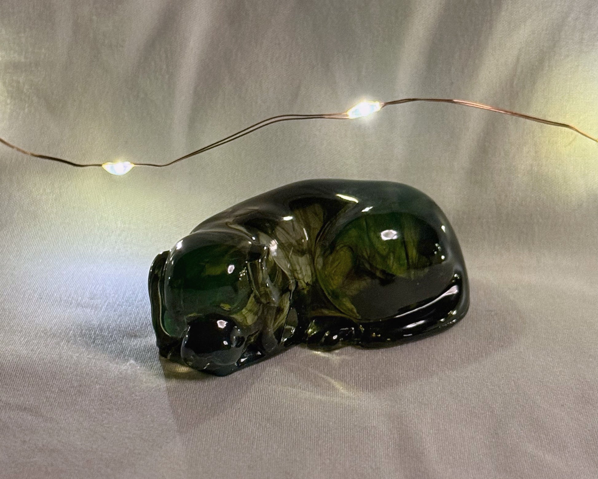 This small handmade resin dog rests peacefully, capturing the calm of a forest in its deep green tones and soft, organic swirls. The translucent layers reflect light beautifully, giving the piece a natural depth that feels grounding and tranquil. Each sculpture is hand-poured, creating unique patterns that make every dog one-of-a-kind.