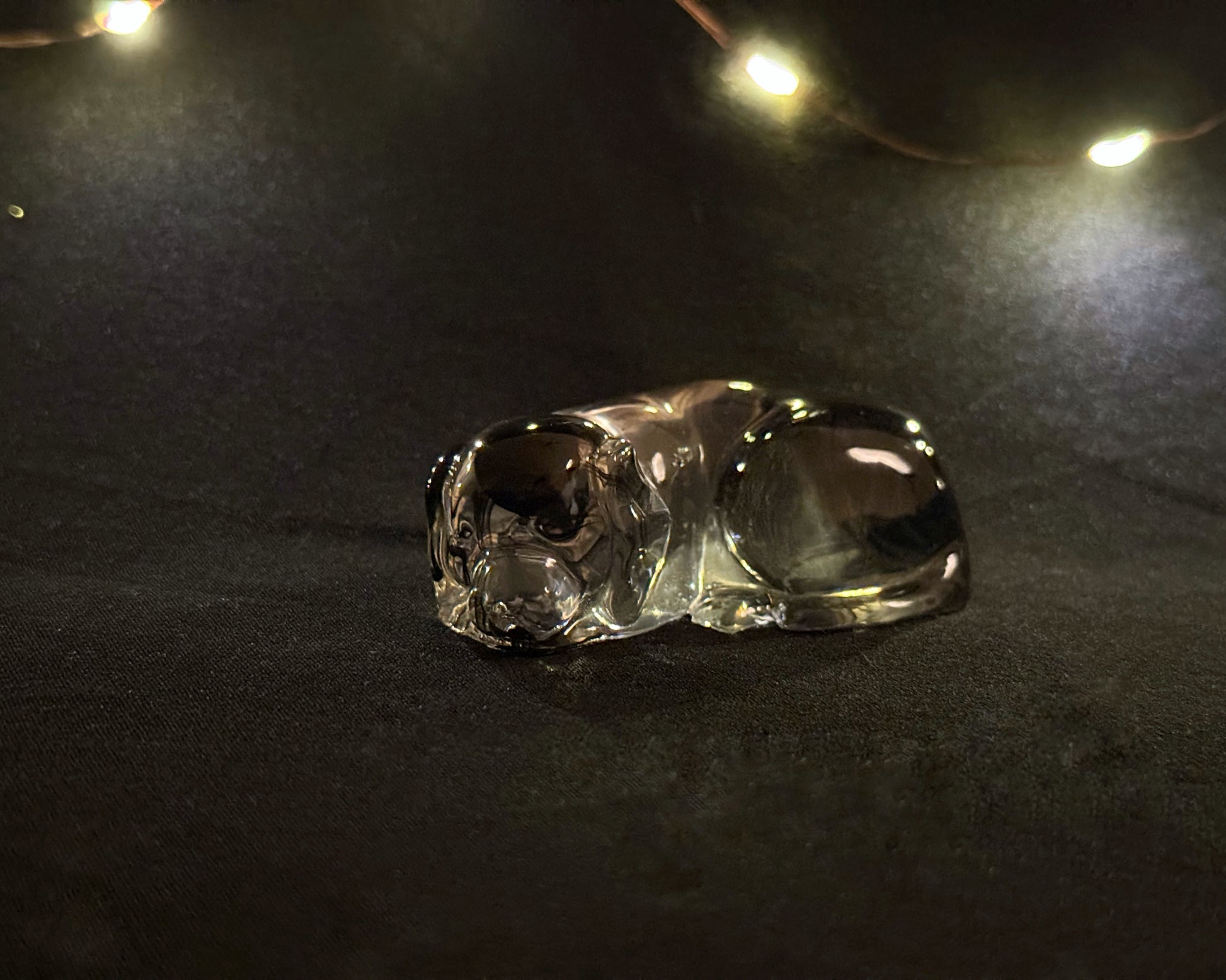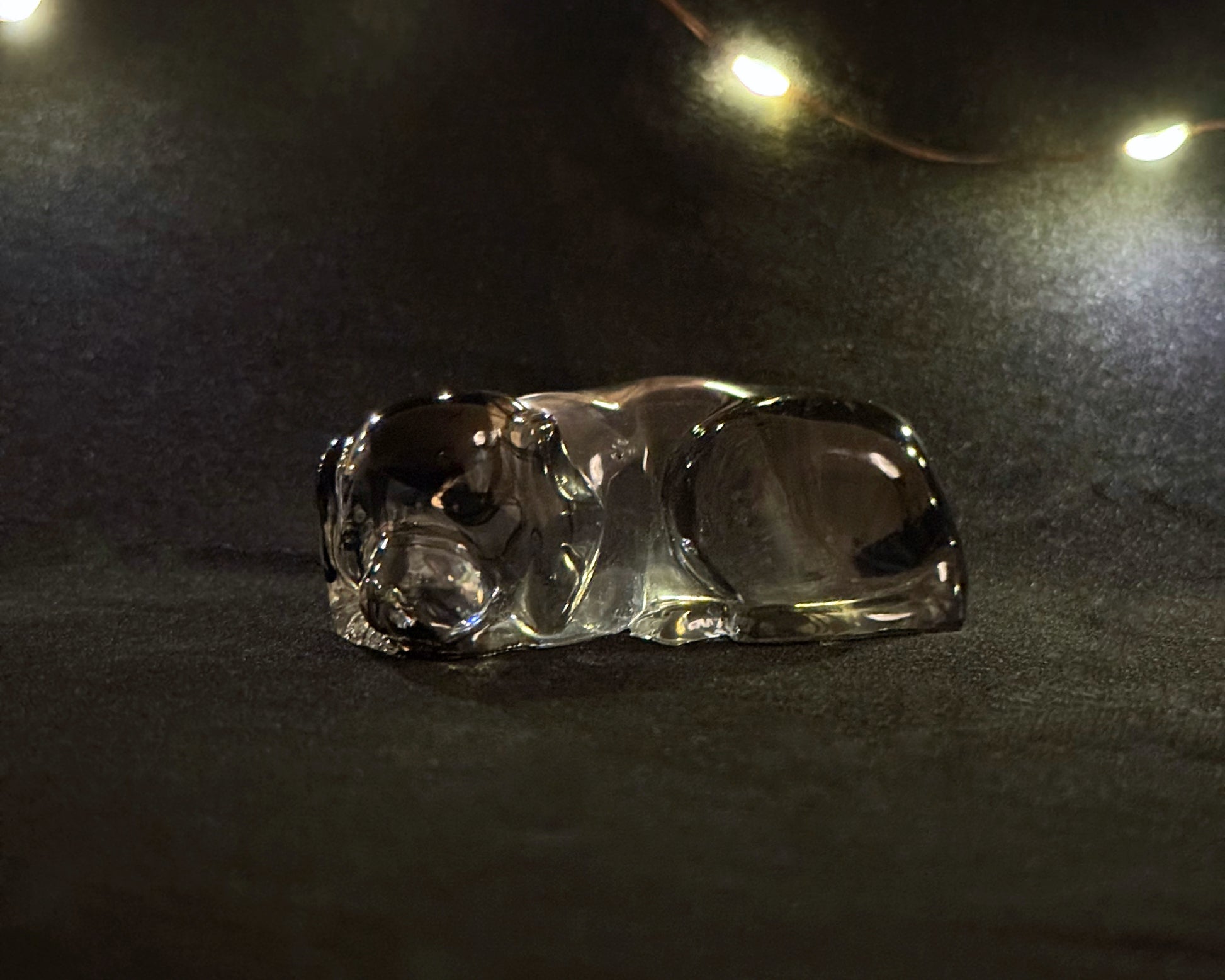 This small handmade resin dog rests peacefully, its smoky gray tones swirling gently through a crystal-clear base. The subtle gradients give it a mysterious yet calming energy, perfect for adding a touch of quiet beauty to any shelf or windowsill. Each sculpture is hand-poured, making every dog a unique little companion full of personality and charm.