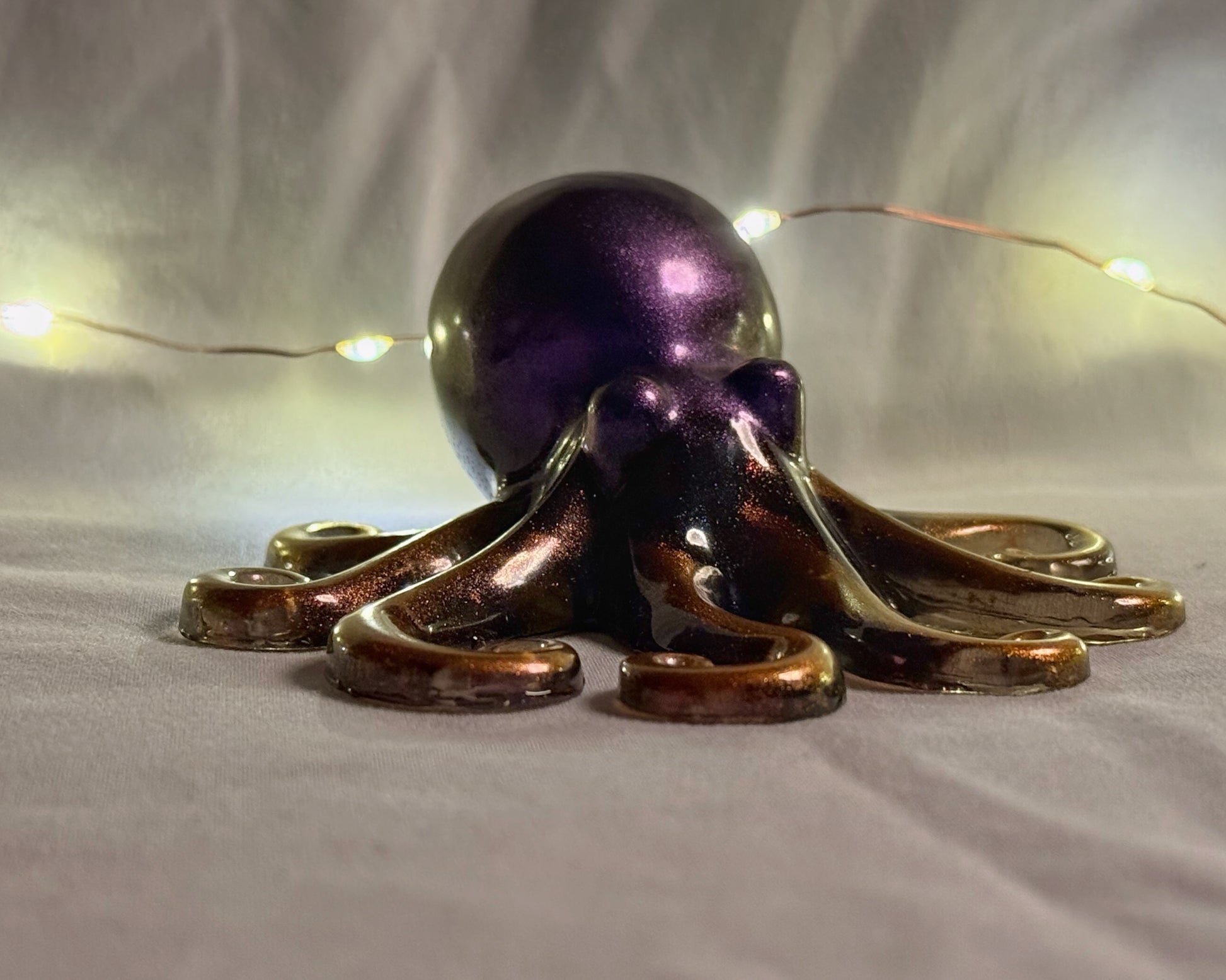 This handmade resin octopus features a rich blend of deep violet, bronze, and gold, creating a smooth metallic finish that shifts beautifully in the light. Its detailed tentacles and glossy surface make it a striking accent piece for any shelf or desk. Each octopus is individually crafted by hand, so every one has its own unique color pattern and character.