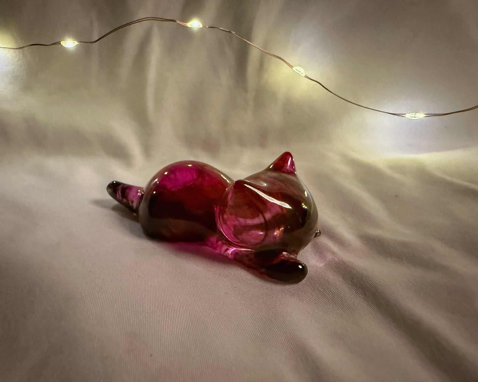 The Tiny Cat Plum Dream glows with warmth and spirit. Crafted from vibrant plum-colored resin, this miniature cat captures the light beautifully, revealing dreamy tones that shimmer like gemstone glass. Perfect for collectors or small-space décor, this little cat brings a touch of charm and tranquility wherever it rests.