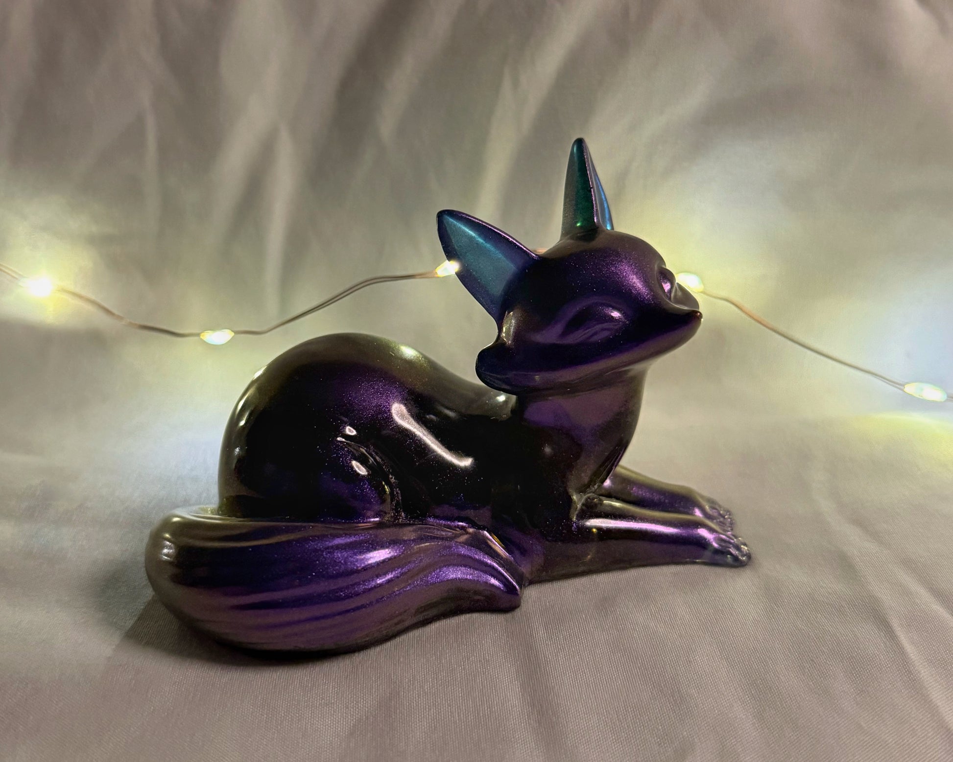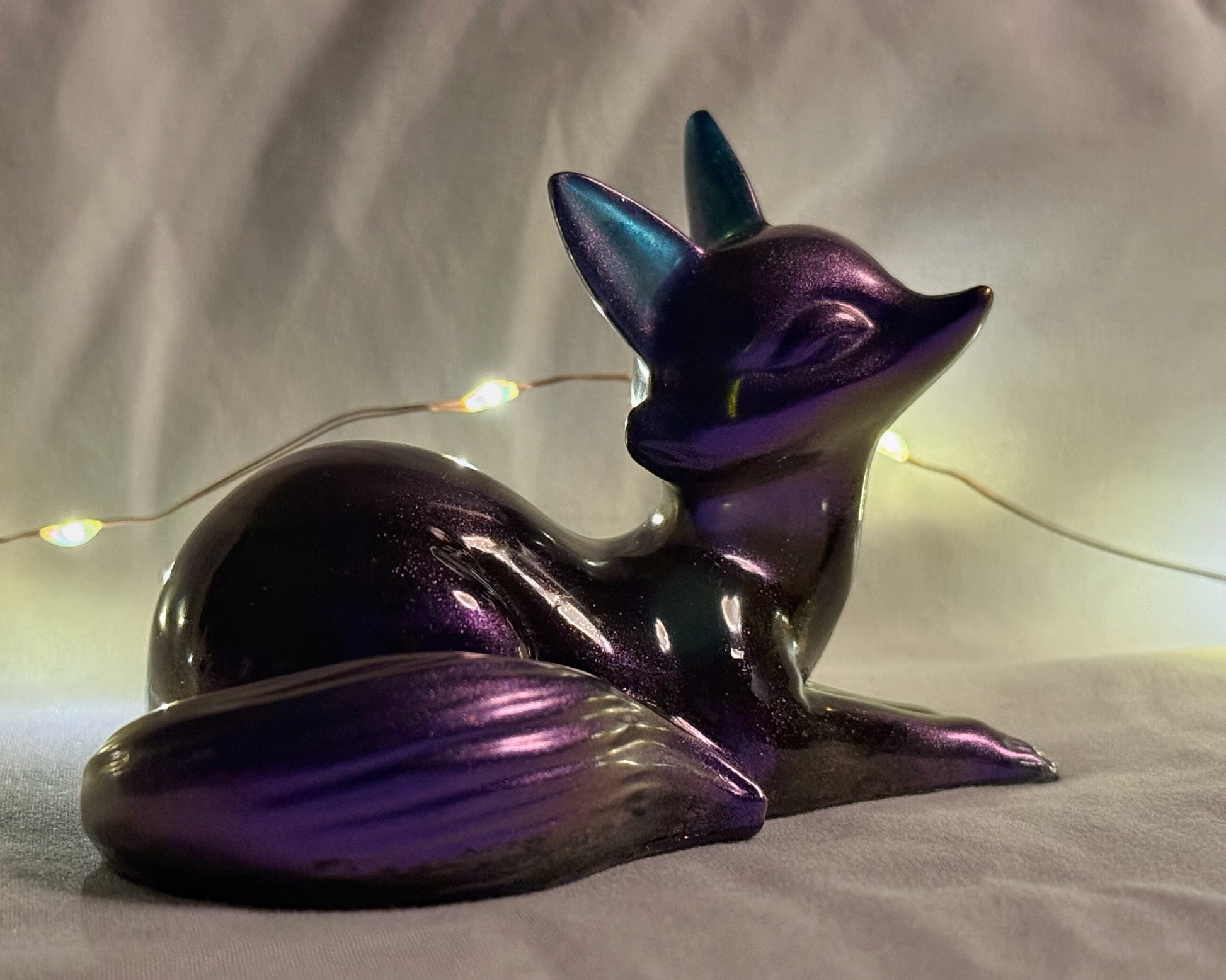 This handmade resin fox glows with a deep violet finish, accented by cool blue highlights that shift gently in the light. Its sleek, sculpted form gives it an elegant and peaceful look, making it a lovely addition to any collection or display. Each piece is individually crafted, so no two are exactly alike.